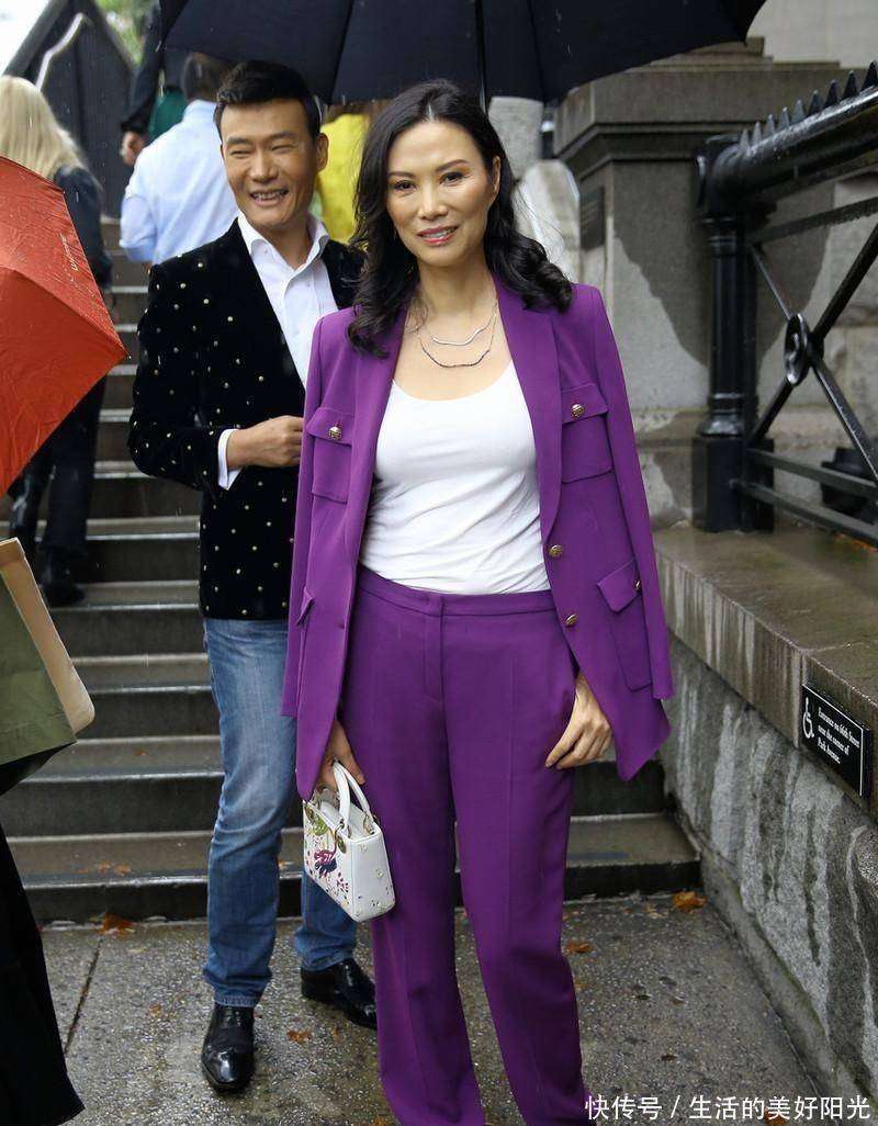 邓文迪一直钟爱深色系的西装,尤其是紫色。记得有一次,她穿了一件紫色西装,肩部设计宽大,腰部收得非常紧,搭配的是一条直筒裤和一双小白鞋。整体造型看起来像是男装,但她内搭了一件白色紧身背心,恰到好处地展现了她的身材线条。这种反差搭配让人眼前一亮——西装的硬朗与背心的柔美相得益彰,完美展示了她对穿衣风格的独到理解。