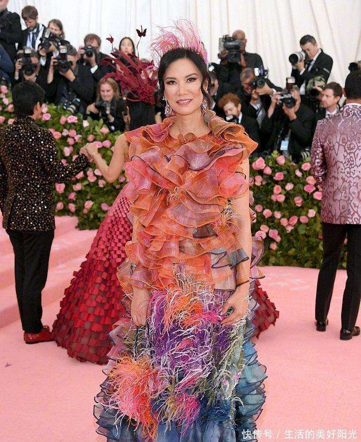 最令人印象深刻的是她穿过的一条渐变裙,裙摆是橙粉色的薄纱,上面点缀着彩色羽毛,甚至头上也戴着羽毛装饰。那时她走红毯时的旗袍造型更是惊艳,整件旗袍满身玫瑰刺绣,领口设计是中式的高领,半透明的面料隐约透出她的肤色。手上佩戴着钻饰,提着一个黑色的小包,显得高贵又优雅。这些衣服对于普通女孩来说,可能都不敢尝试,但邓文迪总是能把这种大胆的尝试演绎得淋漓尽致。