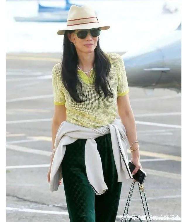 另一次,她选择了polo衫搭配绿色裤子。上身是轻薄的绿色网眼衫,衣领和袖口的撞色设计增添了一丝趣味,而下身则穿了一条墨绿色丝绒裤。丝绒的光泽感与polo衫的材质形成了鲜明对比,显得既特别又不突兀。她还配戴了一顶米色的大檐帽,手提简约的小包,脚踩高跟鞋,整体搭配既不失个性,又充满了优雅气息。这样的混搭风格在街头并不常见,但邓文迪穿起来却显得相得益彰。
