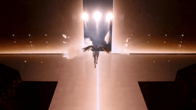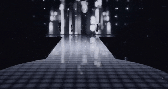 进行到最后一个部分,舞台的颜色瞬间沉静了下来,模特们从粉雾梦境中走回现实,性感开始展露锋利的一面。很巧妙的是背景音乐echo back了大秀开场,延续了诸神之战。