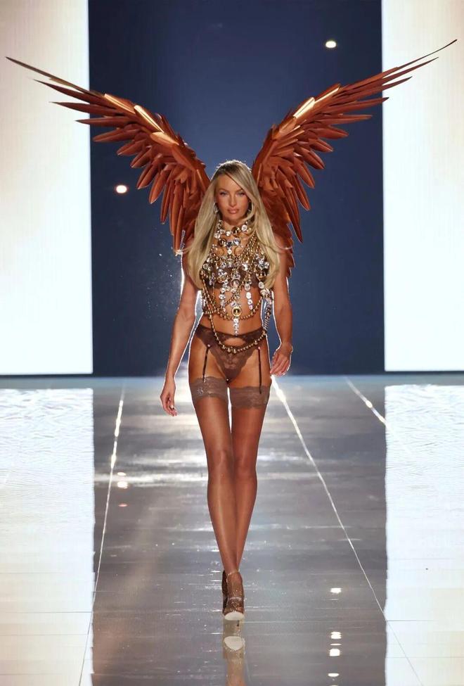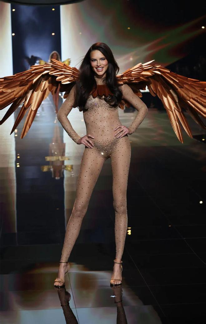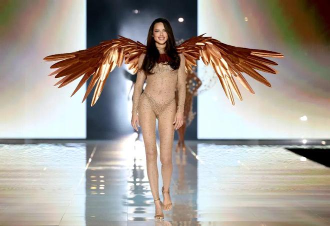 今年是AA第19次走维密大秀,她一出场时还是那种熟悉的阿尔法气场,金铜色羽翼在她身后舒展成一道心形的光环。