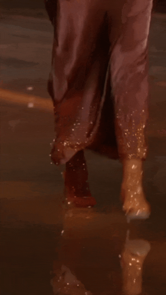 莲姐(Irina Shayk)的第二个look也相当诱惑。她穿着立体剪裁的红色蕾丝胸衣与高开衩纱裙,裙摆像烈焰一样在她身边翻卷。