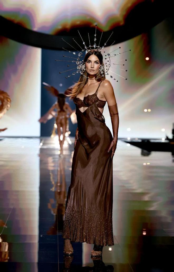 Lily Aldridge出场的时候,巧克力色的丝缎长裙轻盈滑过舞台,头顶的水晶日冕散发神秘的光晕。