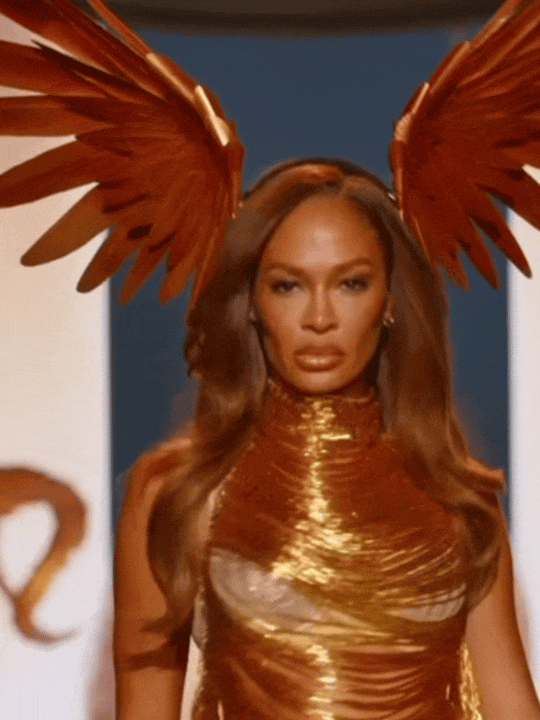 Joan Smalls的装扮则主打一个霸气,金色流苏富贵迷人眼,手扶羽毛头饰的时候简直像女王戴稳她的王冠,不愧是曾经有“末代一姐”之称的超模。