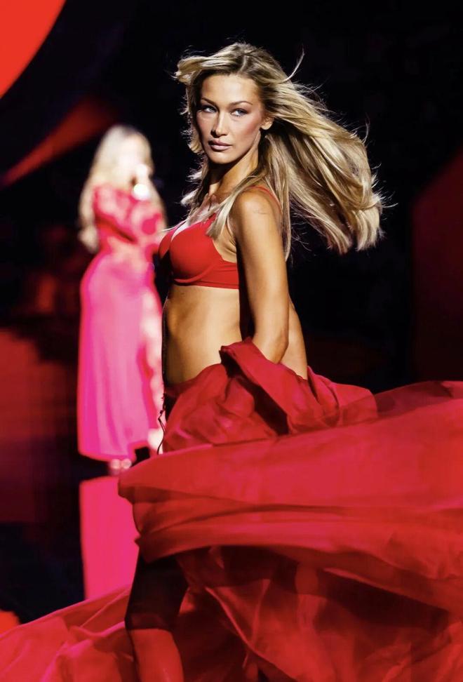 第一个出现的是Bella Hadid。她穿着一套亮红色蕾丝内衣,搭配吊带袜与高跟鞋,外罩一袭轻盈如火焰般飘动的雪纺长纱。