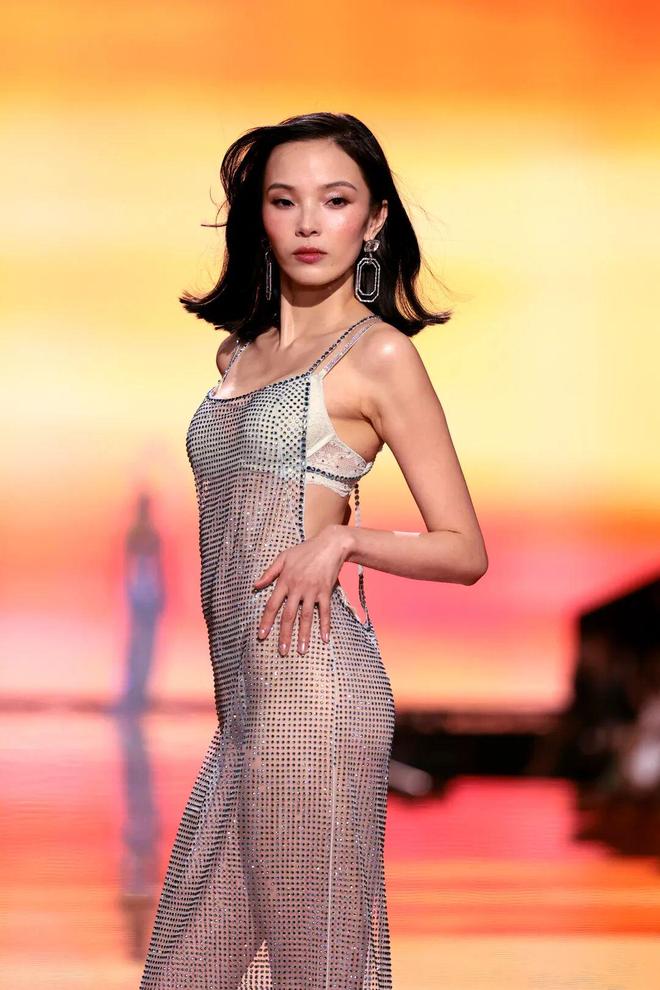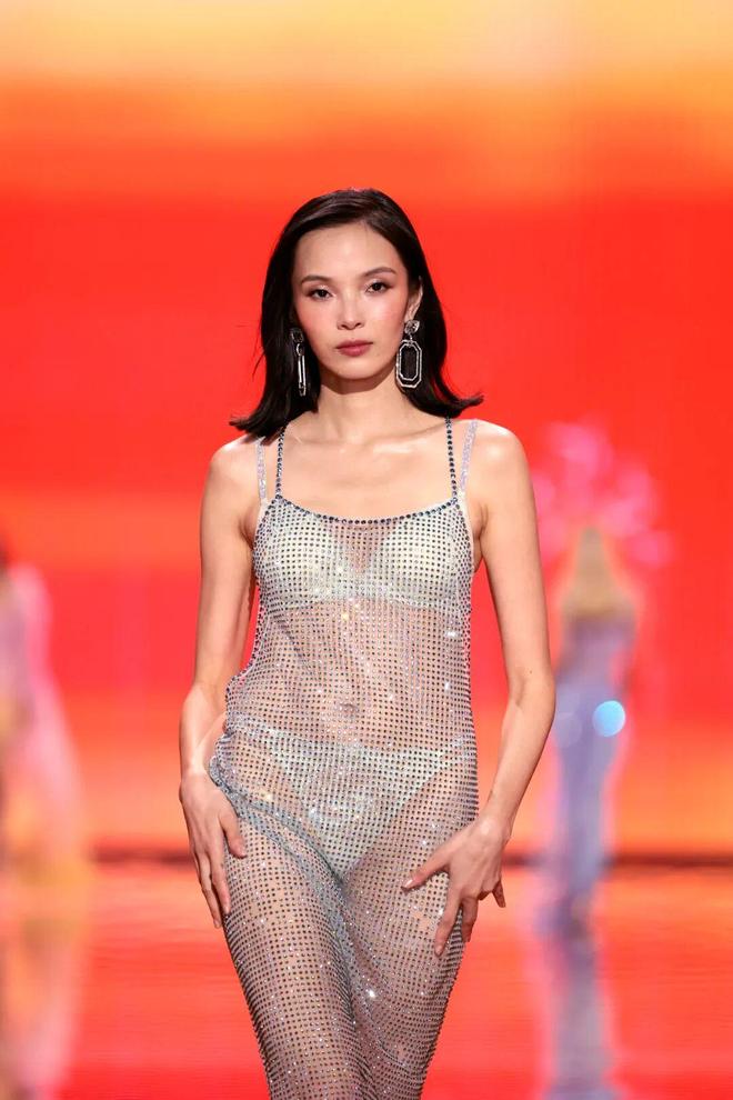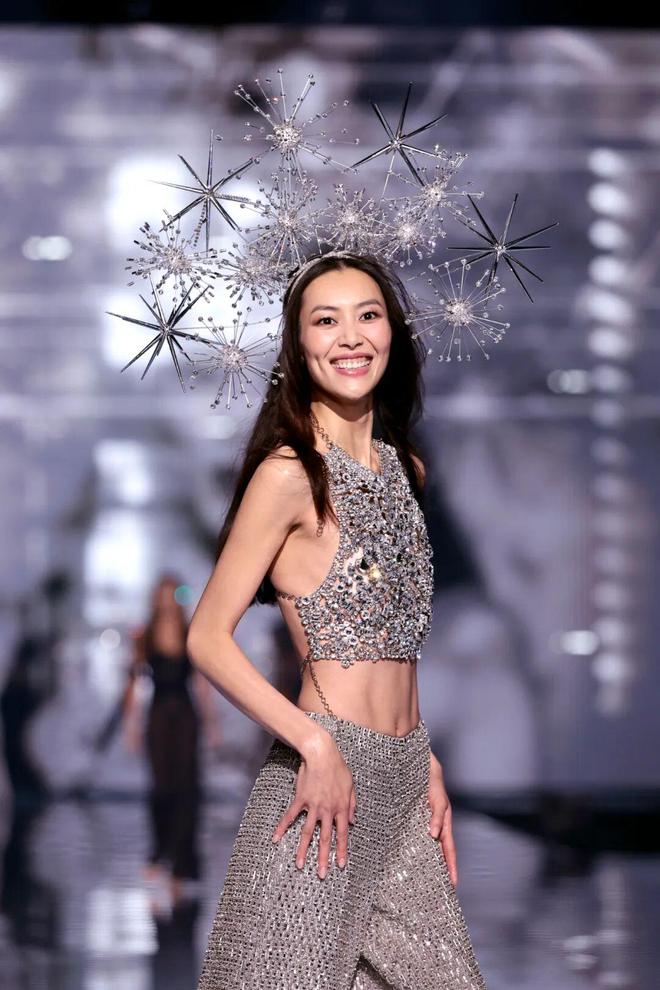 当时隔8年重返维密舞台的雎晓雯走出来的时候,我真的觉得好感慨啊。她的气质完全变了一个人。银白色的水晶网纱长裙,若隐若现地勾勒出身体线条,细密的钻饰在灯光下像流动的星光。