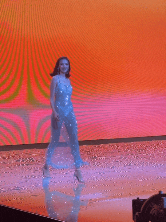 满是银色亮片的无袖短上衣与阔腿裤让她整个人闪着柔和的光。头顶星云状的头饰随着步伐轻轻摇曳,像漫天星尘都围着她转。