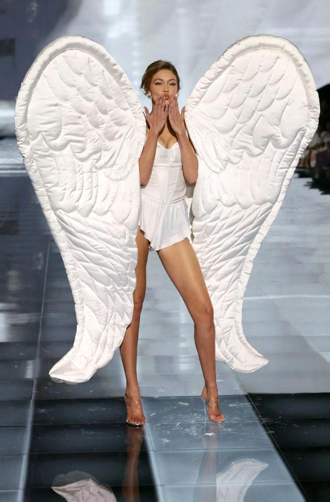 桃红色的蕾丝内衣配上层叠花瓣长袍,甜美又有气势,标准的维密式华丽。今年是Gigi第5次出现在这个舞台了。